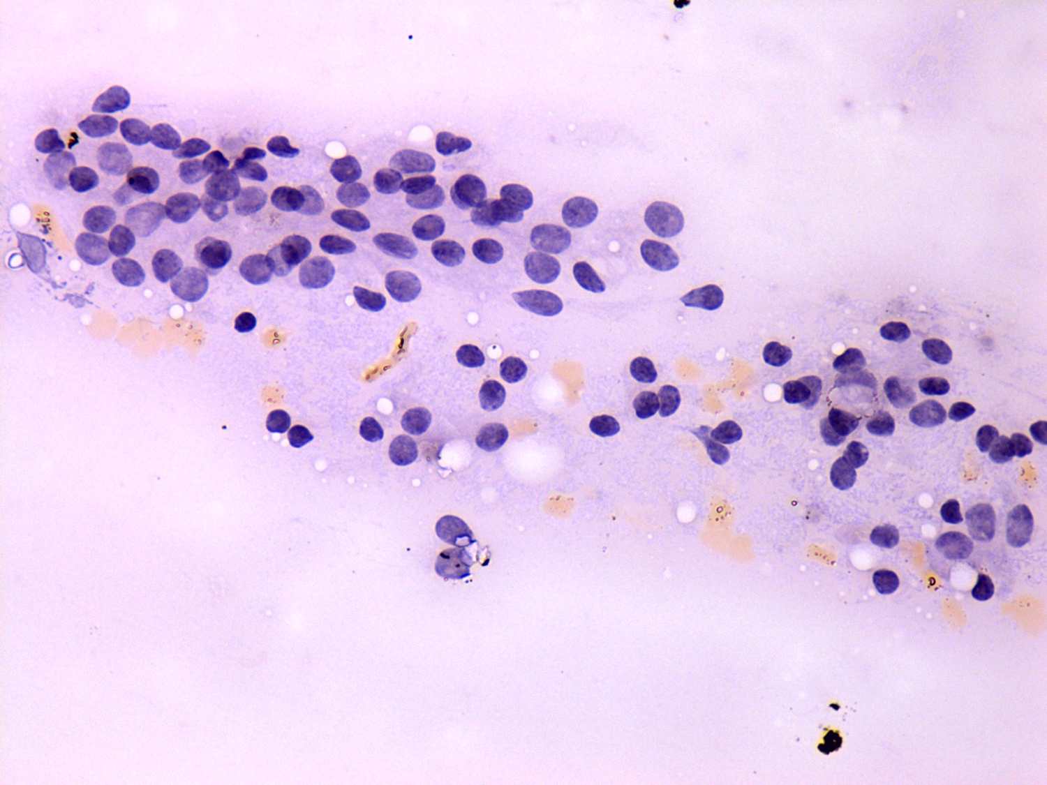 Pap-smear, 400x. Note colloid. Follicular cells in micro- and normofollicles. Dissociated pycnotic nuclei are also found.