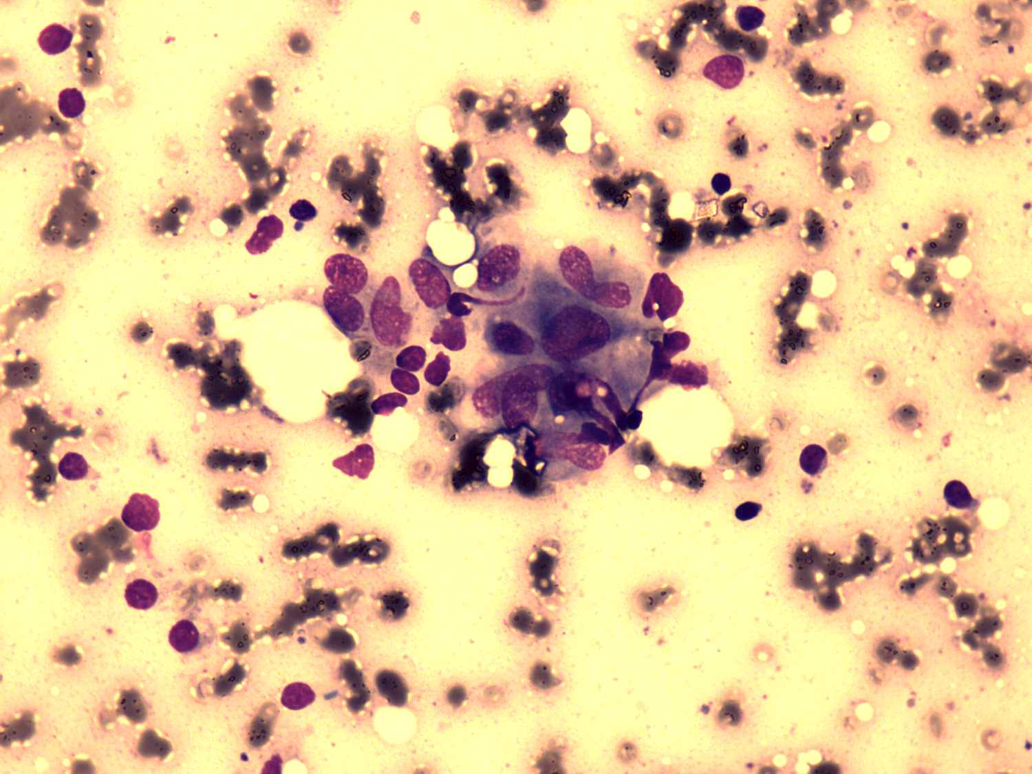 Wright-Giemsa staining, 400x. A cluster containing epitheloid cells. The presence of the latter favours the diagnosis of de Quervain's thyroiditis.
