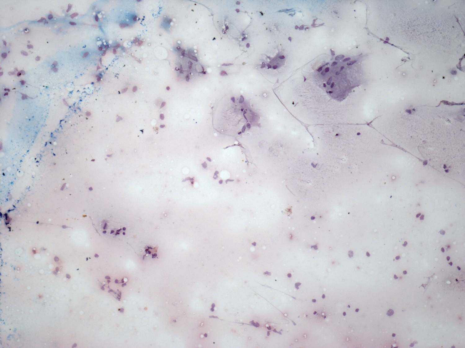 Pap-smear, 100x. Multinucleated giant cells composed of comma-shaped epitheloid cells are presented.