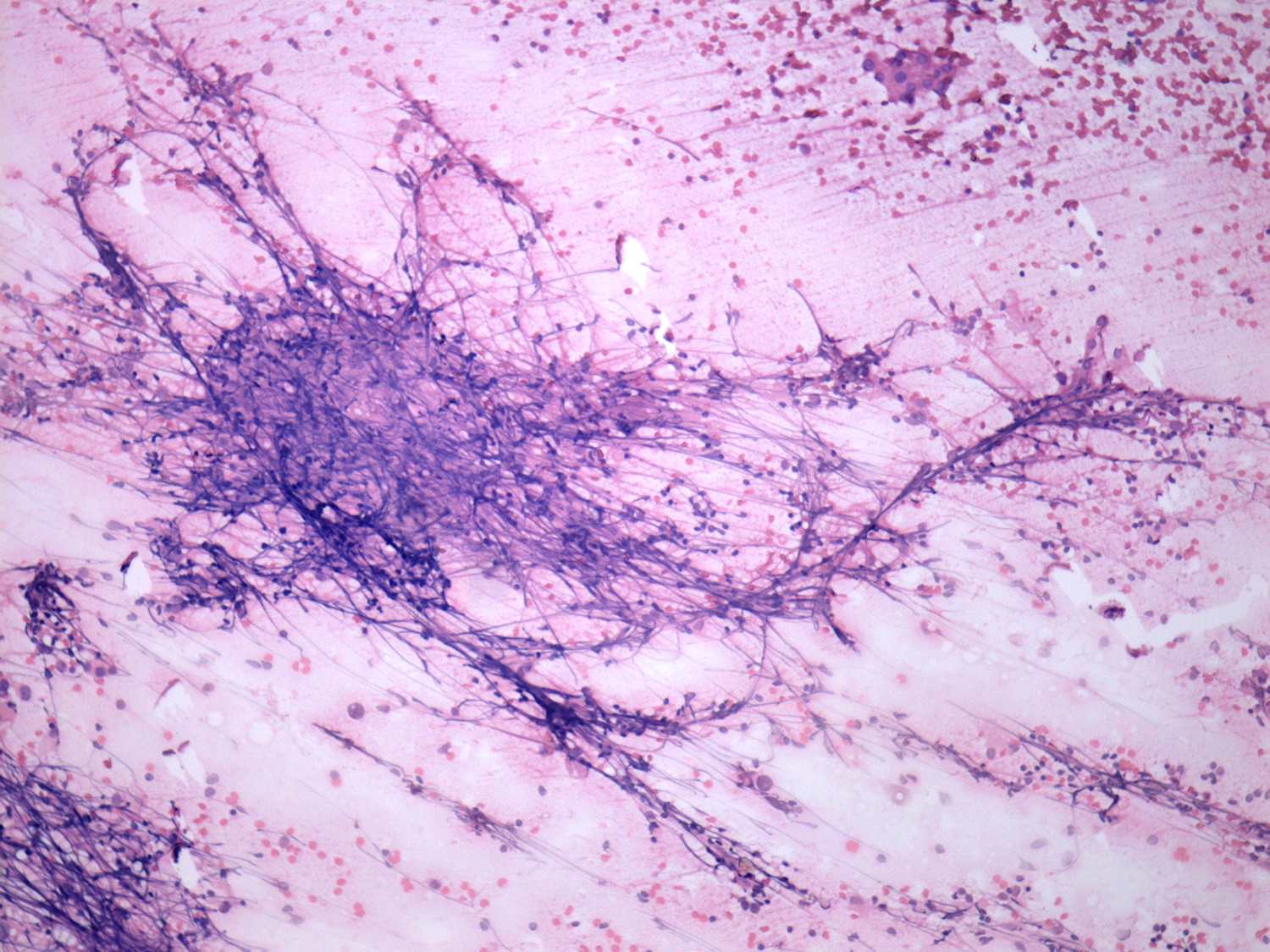 Pap-smear, 100x. Lymphoid cells and nuclear debris are demonstrated here.