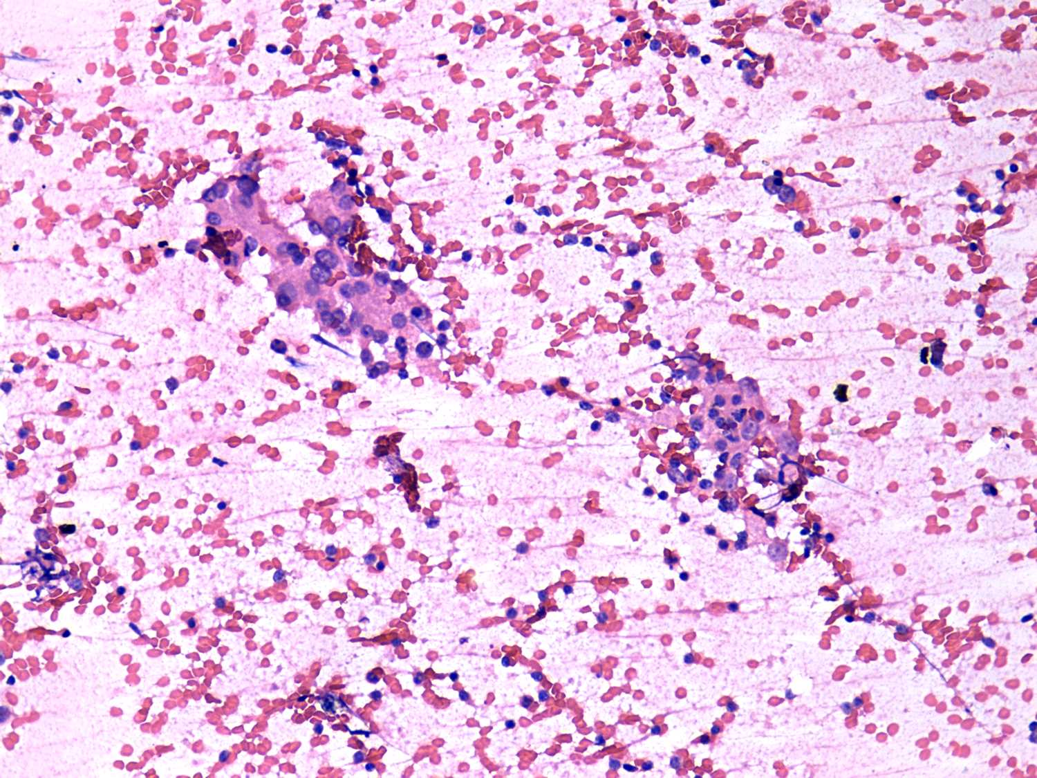 Pap-smear, 200x. Two groups of oxyphilic cells forming normofollicles.