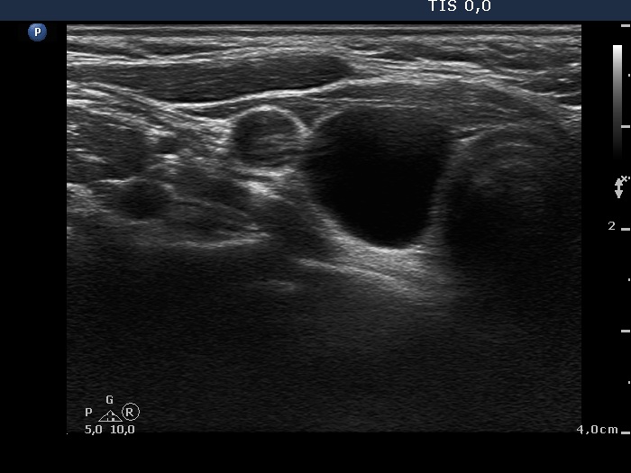 Ultrasonography: the thyroids were echonormal. There was a cystic lesion in the lower-dorsal part of the right lobe.