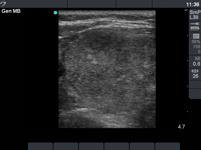 Palpation: a moderately firm nodule in the right lobe.