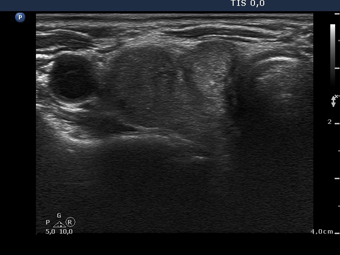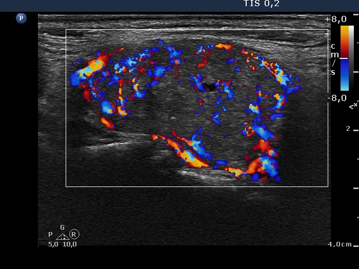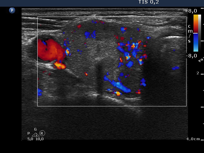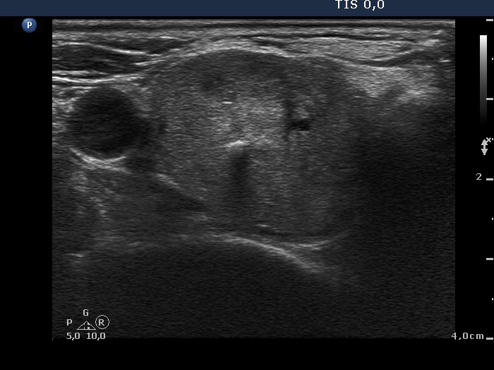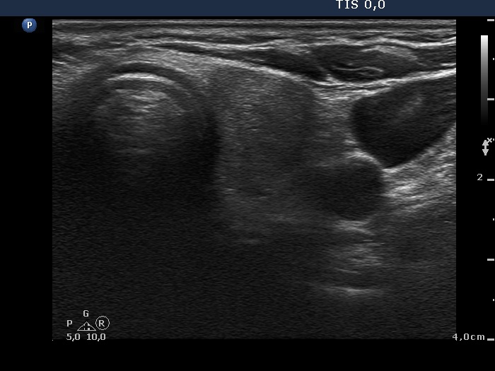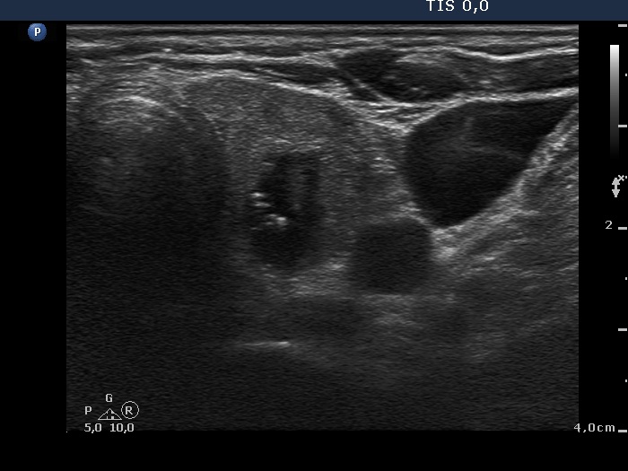 The upper part of the right lobe seems to be nodular, i.e. composed of two nodules at first sight. However, an insertion of the connective tissue and an acoustic shadow of a coarse calcification divides this part of the thyroid to two lesions. These do not fit nodules in a pathological sense.