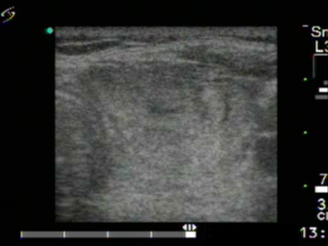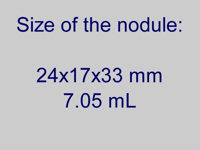Clinical presentation. A 65-year-old colleague was regularly checked for more than a decade because of a nodule in the left lobe. At first visit the size of the nodule was 15x11x22 mm. Except for cosmetics the nodule did not cause complaint.