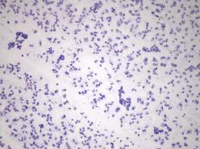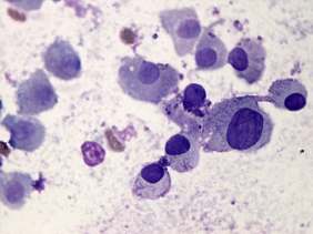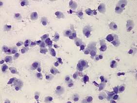 Cytology was performed from the nodule in the right lobe. The cellular smear showed round to polygonal cells with well-defined cell borders. Dissociated cells predominated the smear. The cells presented abundant cytoplasm with granulations.