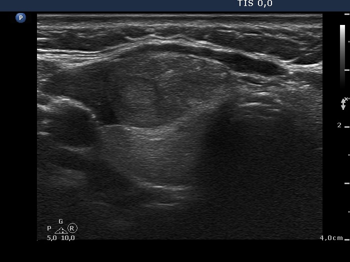 Although the risk of a medullary carcinoma cannot be excluded on the cytological pattern, taking the ultrasound presentation into account, the risk of a medullary carcinoma was very low. Medullary carcinoma is almost always presented in the form of more hypoechogenic nodule.
