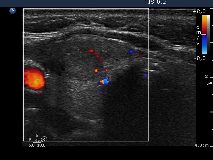 The ultrasound appearance of the lesion was unusual. We could not decide whether this lesion is within or outside the thyroid. Although more than 80% of such cases proves to be of thyroidal origin, additional tests are required to decide te issue.