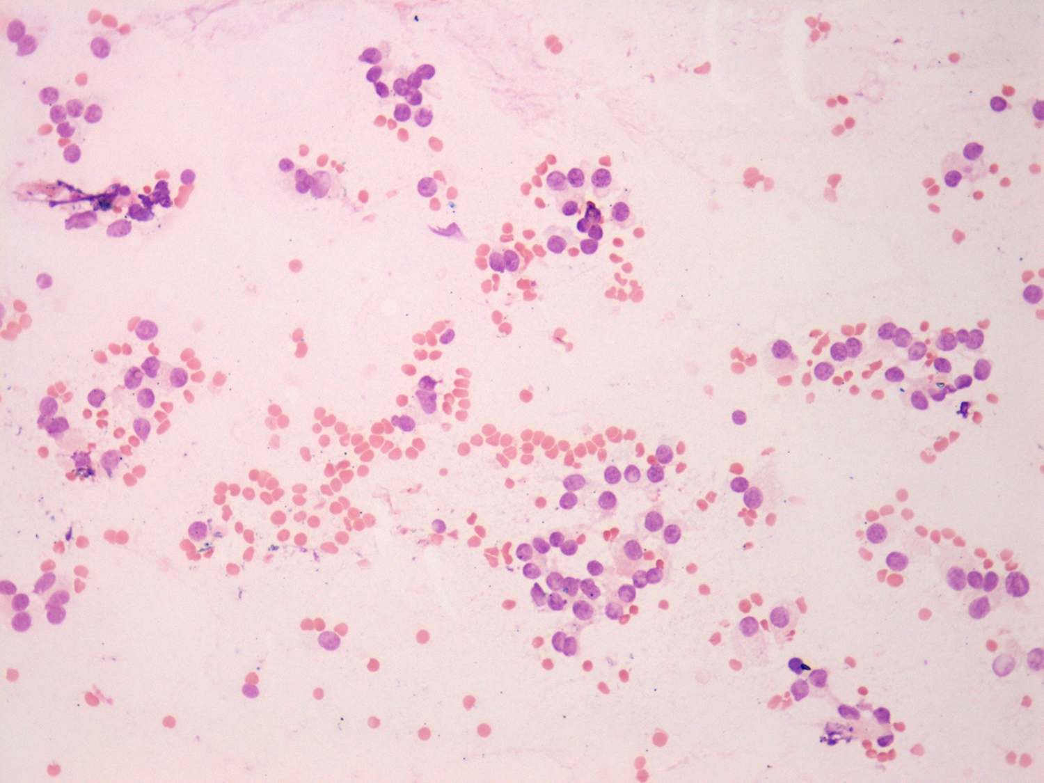 Wright-Giemsa staining, 200x. Follicular cells dispersed in microfollicles.