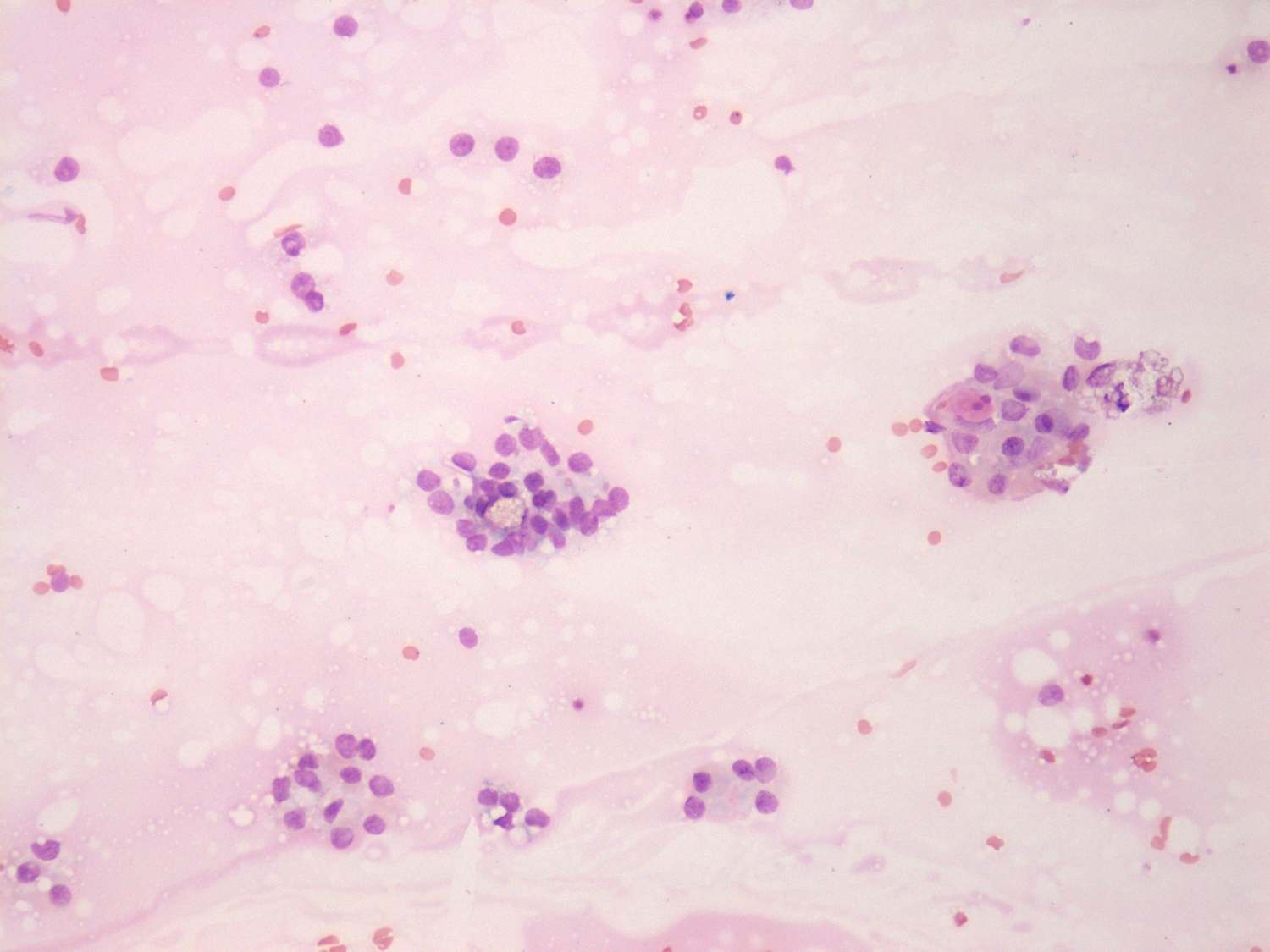Wright-Giemsa staining, 200x. Follicular cells are uniform size and shape.
