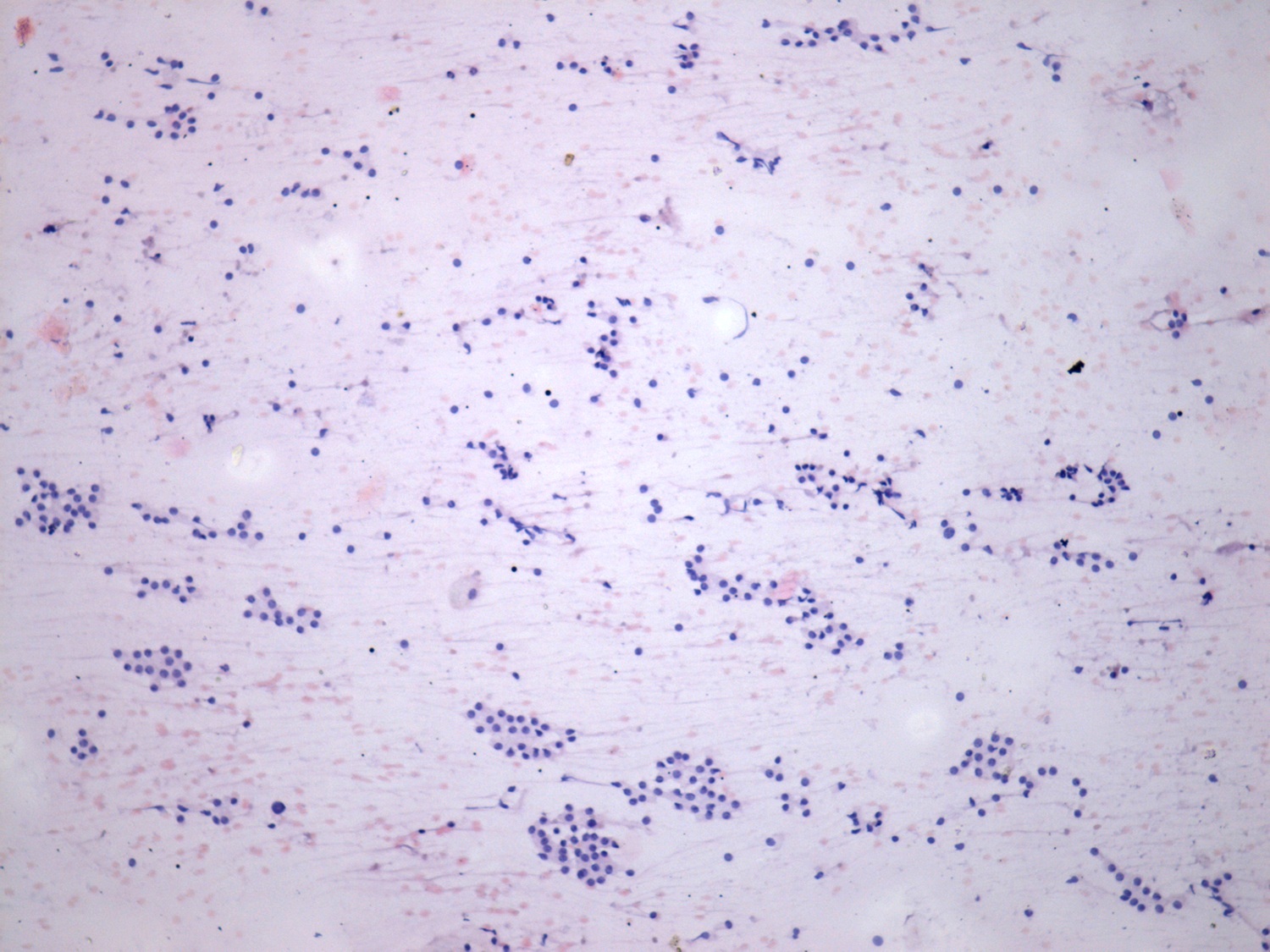 Pap-smear, 100x. There is no colloid in the background. Epithelial cells are in loose clusters and dispersed.