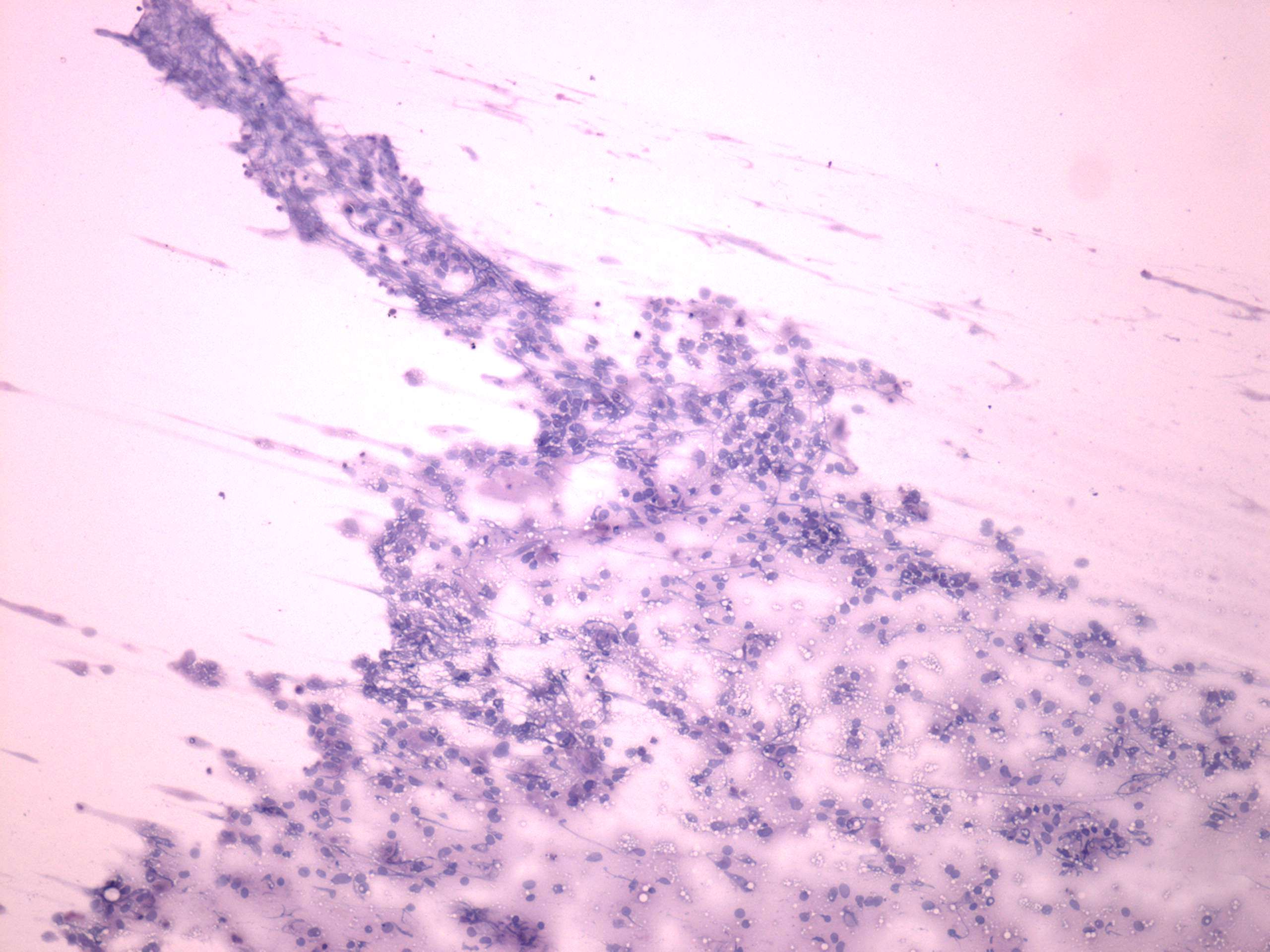 Pap-smear, 100x. There are various inflammatory cells on the smear.