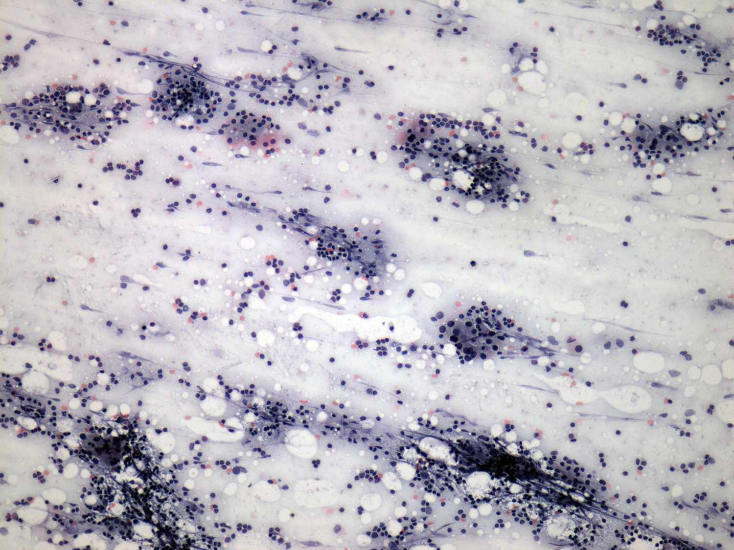 Pap-smear, 100x. Heterogeneous lymphoid cells mixed with groups of follicular cells.
