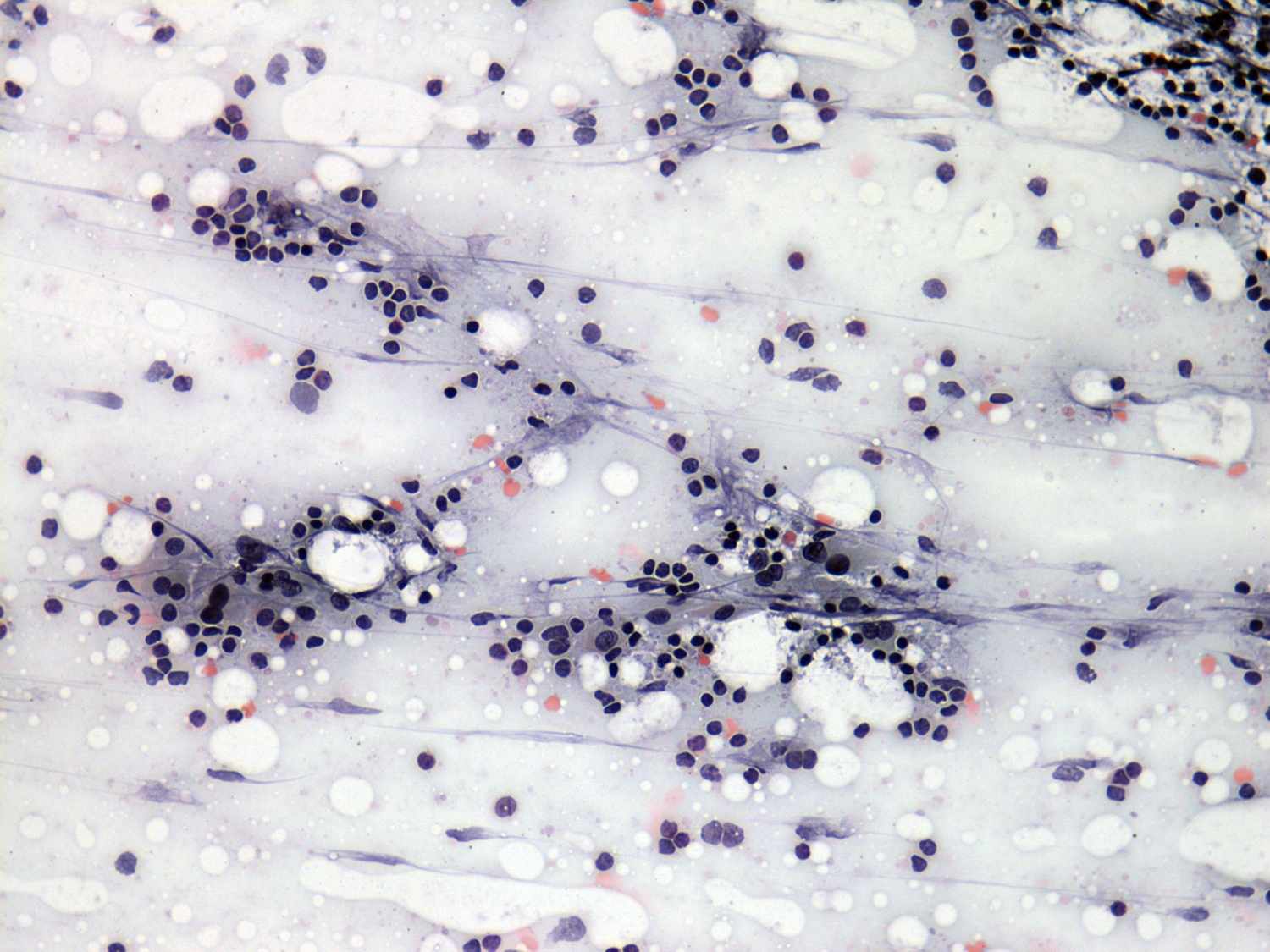 Pap-smear, 200x. Heterogeneous lymphoid elements and nuclear debris.