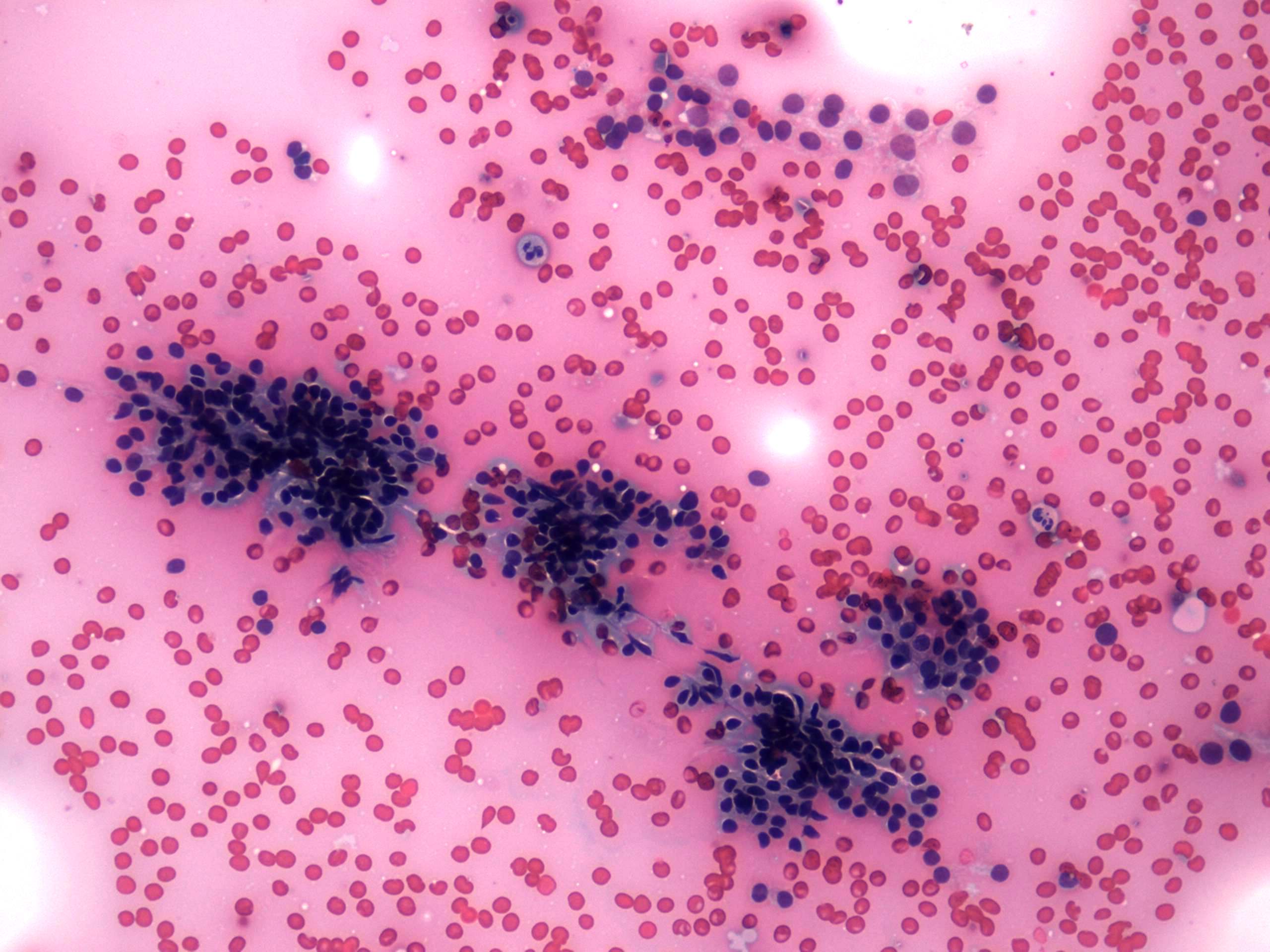 Pap-smear, 200x. Thyrocytes are arranged in regular monolayered clusters composed of microfollicles.