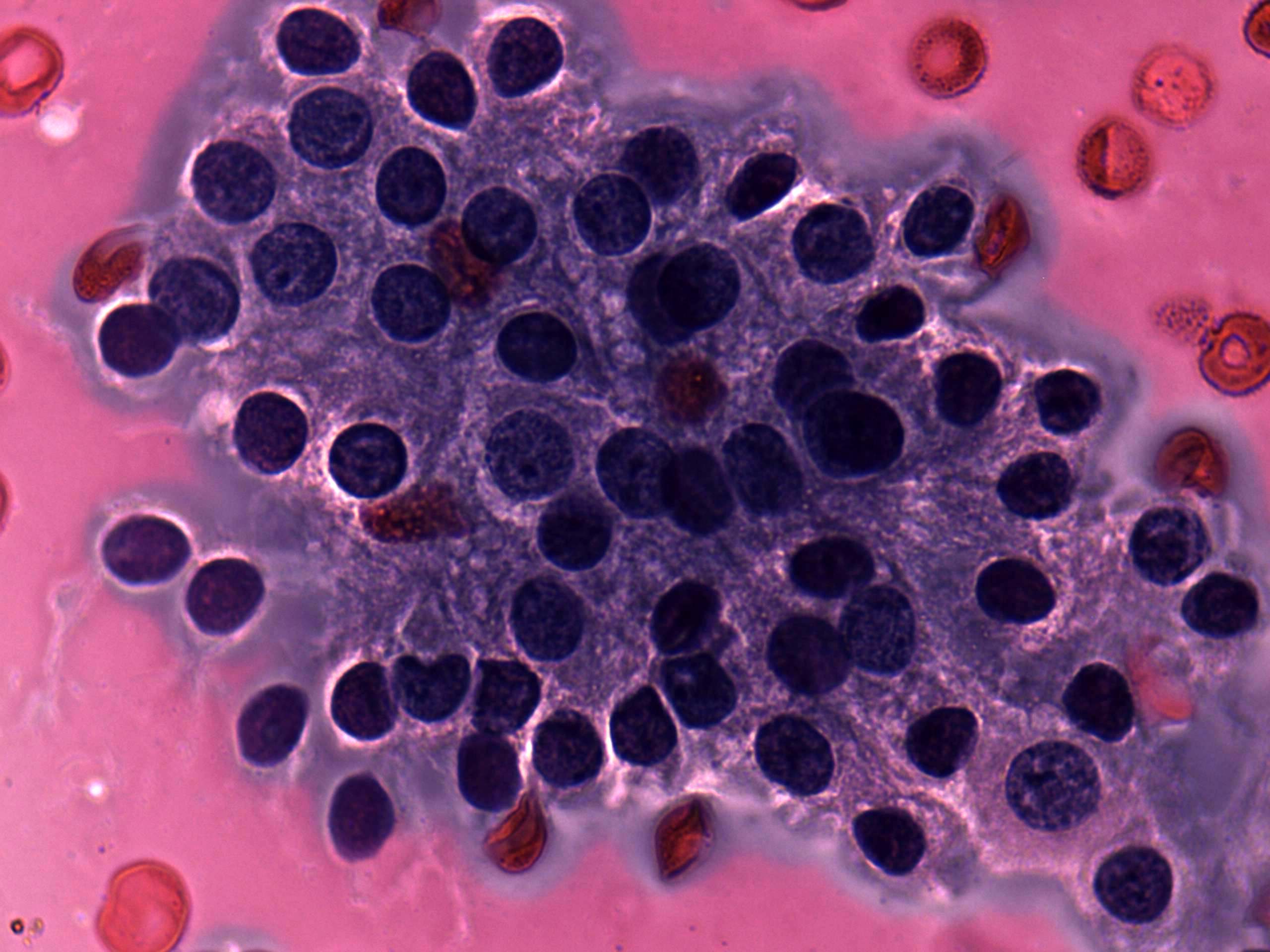 Pap-smear, 1000x. Monolayered sheet of typical follicular cells with finely granular chromatin structure.