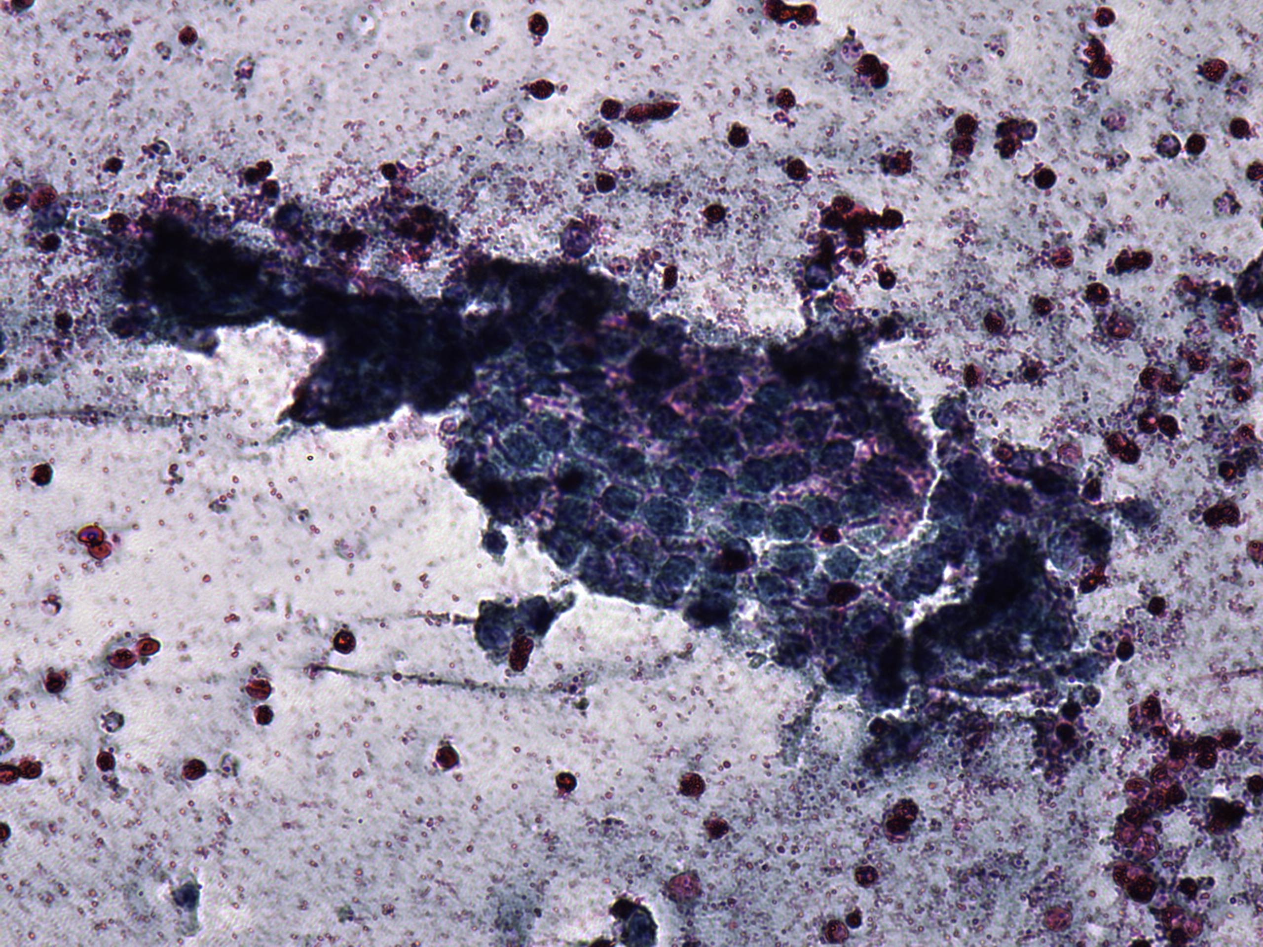 Pap-smear, 400x. Follicular cells do not display any significant atypia.