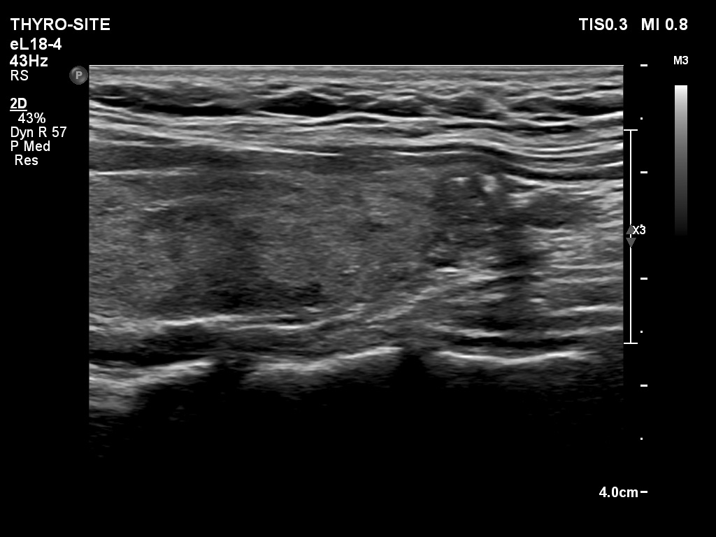 Left lobe, longitudinal scan. The lesion in question has lobulated margins. The lobe contains other hypoechogenic areas corresponding to the underlying Hashimoto's thyroiditis.
