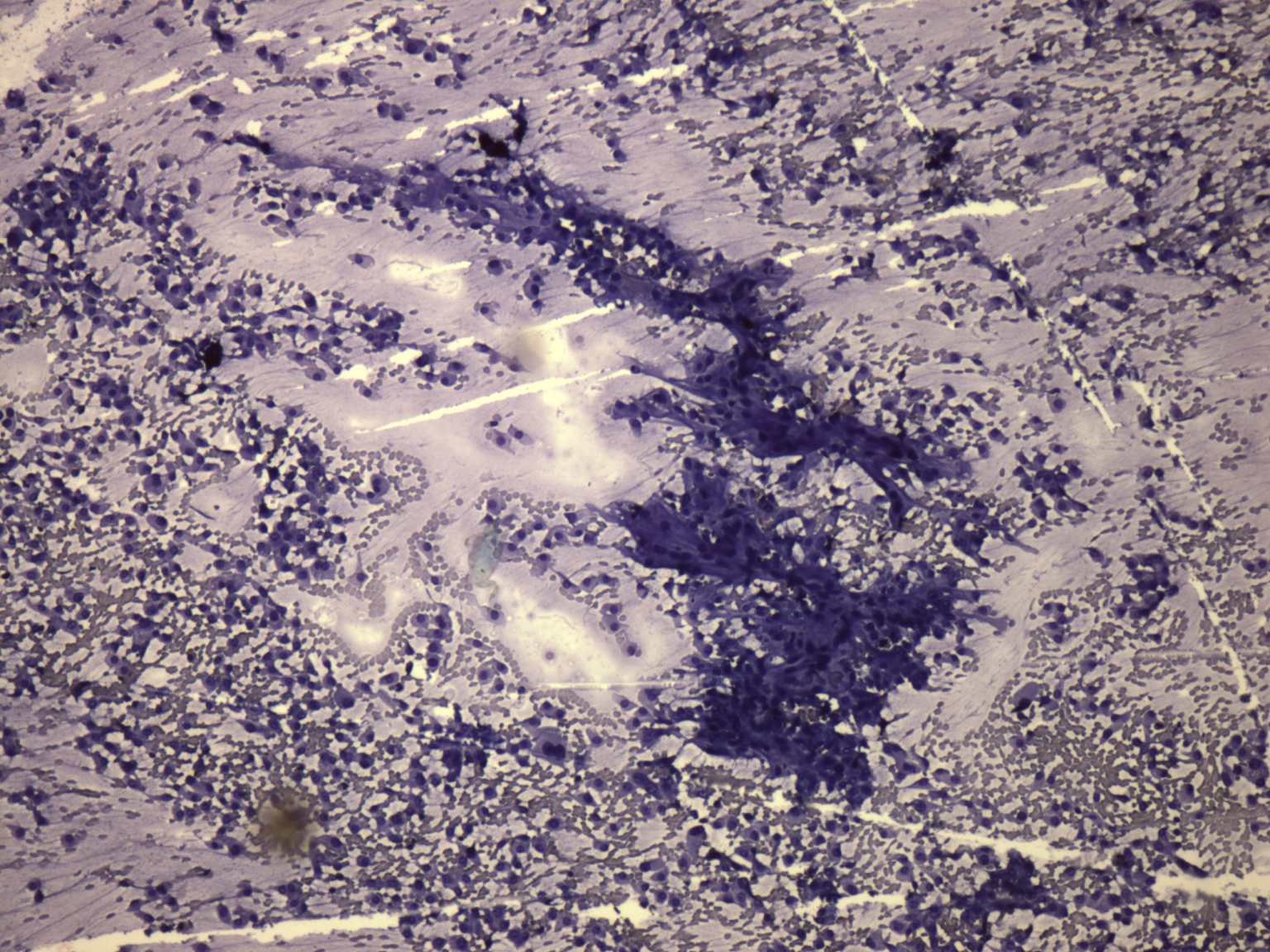 Pap-smear, 100x. Follicular cells in a cluster with hyalinizing stroma.