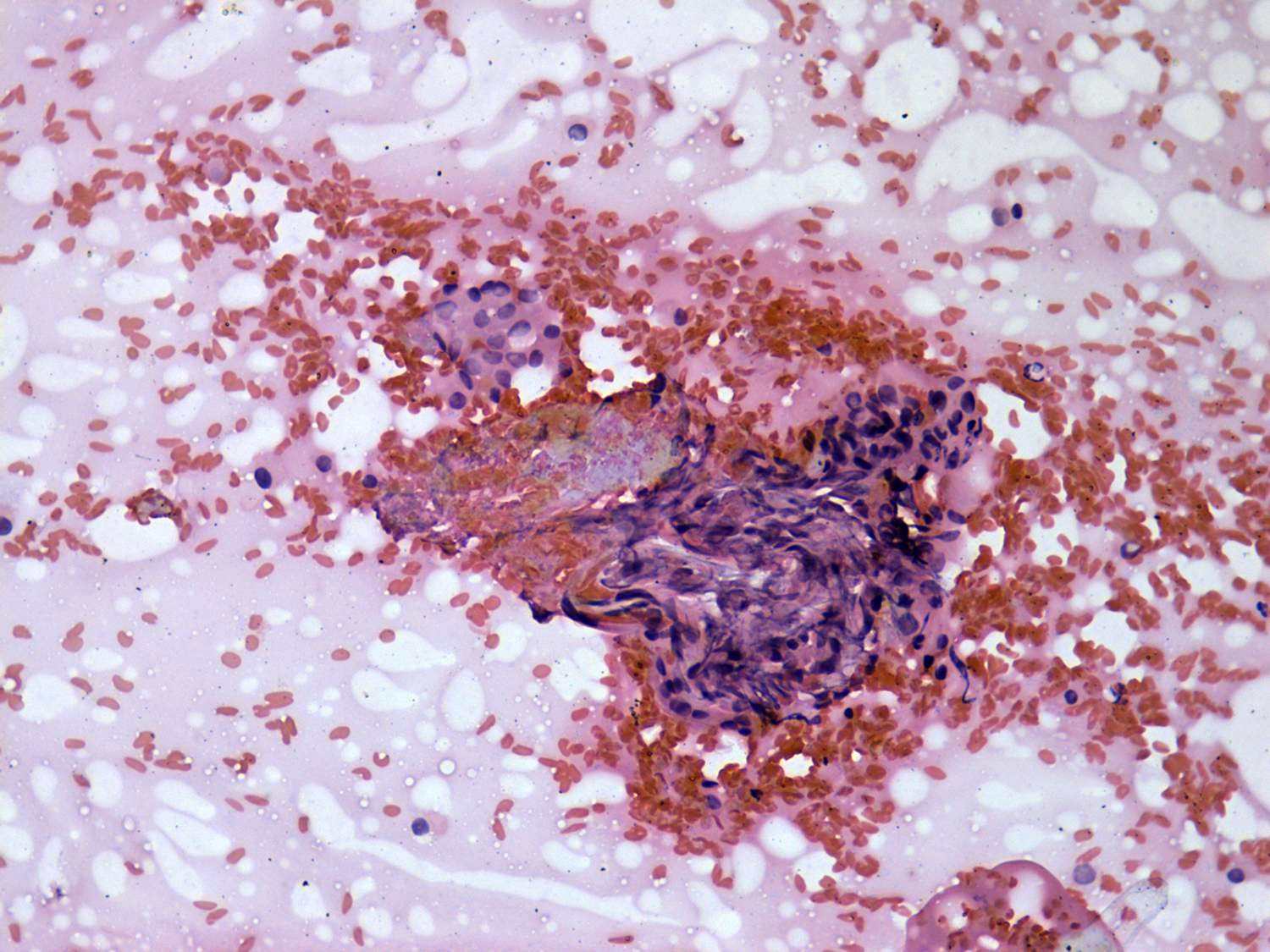 Pap-smear, 200x. The upper-left cell group is composed of oxyphilic cells while the other larger one is composed of degenerated cells. The latter is similar to a multinucleated giant cell of a de Quervain's thyroiditis.
