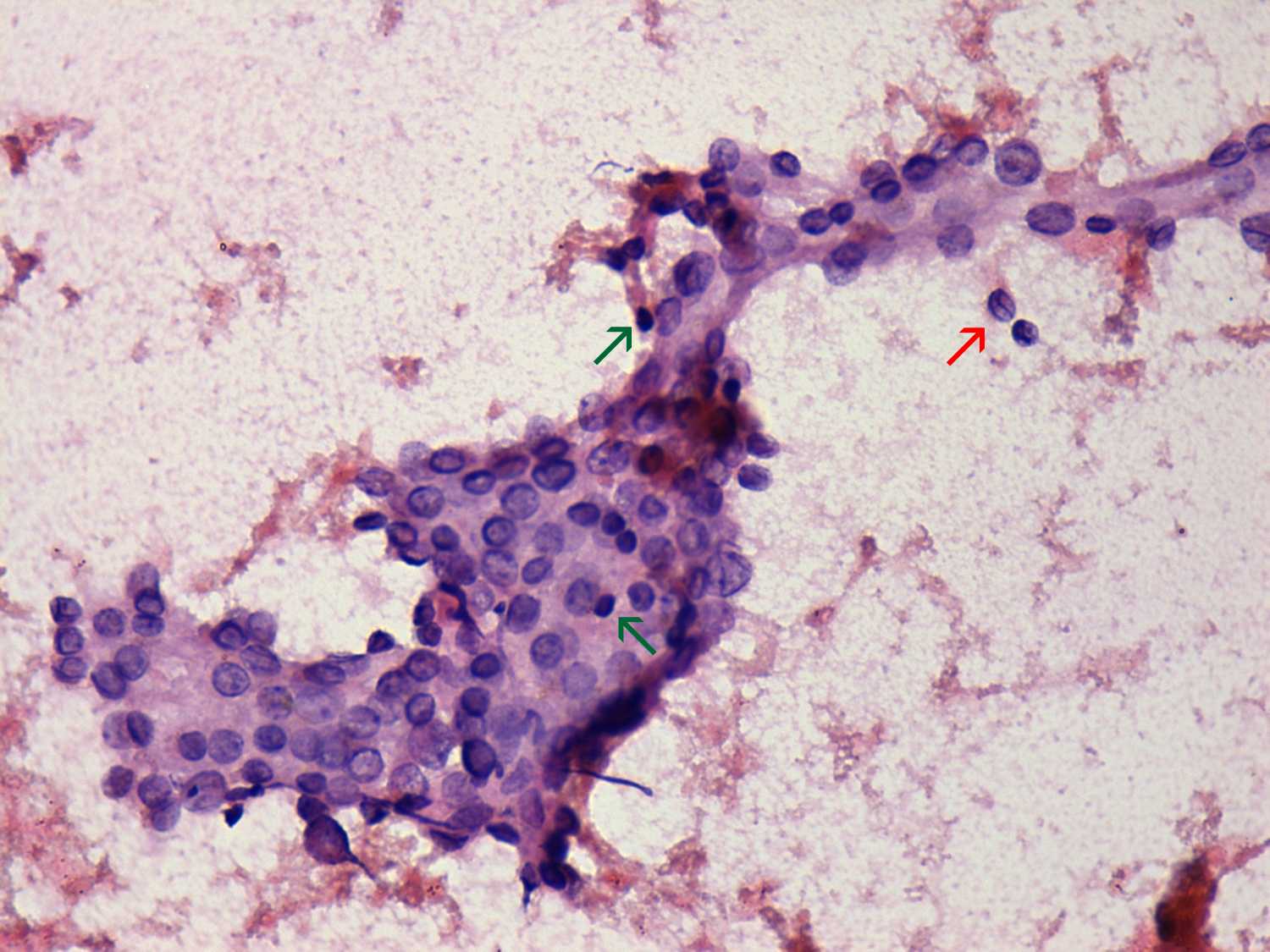 Pap-smear, 400x. There is amonolayered sheet of follicular cells. Note lymphocytes (green arrows) within the cluster and a follicular cell with a groove (red arrow).