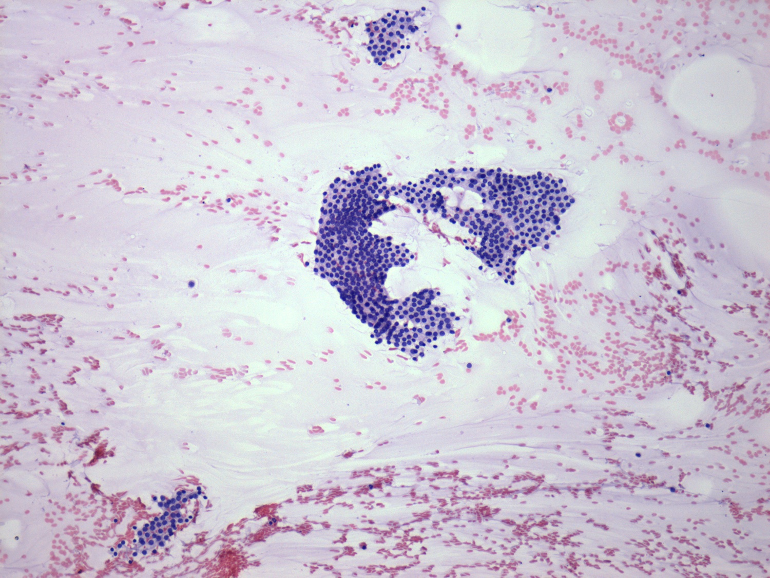 Pap-smear, 100x. Regular monolayered sheets of follicular cells.