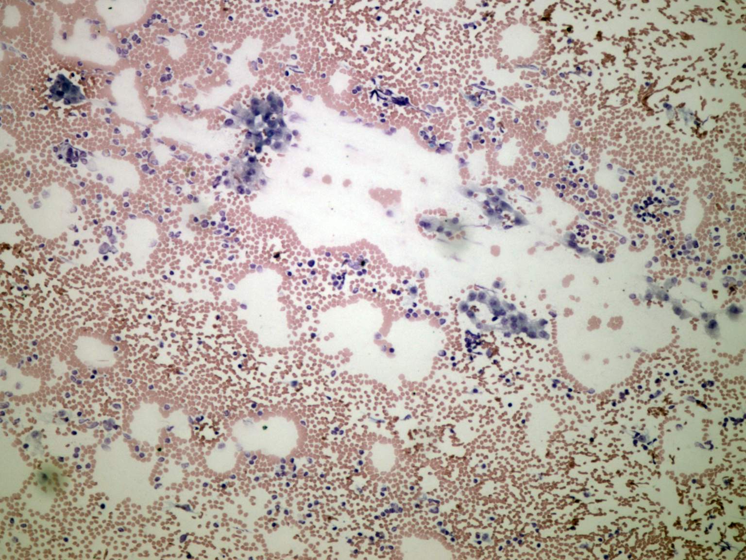 Wright-Giemsa staining, 100x. Follicular cells with abundant cytoplasm and lymphoid elements can be seen.