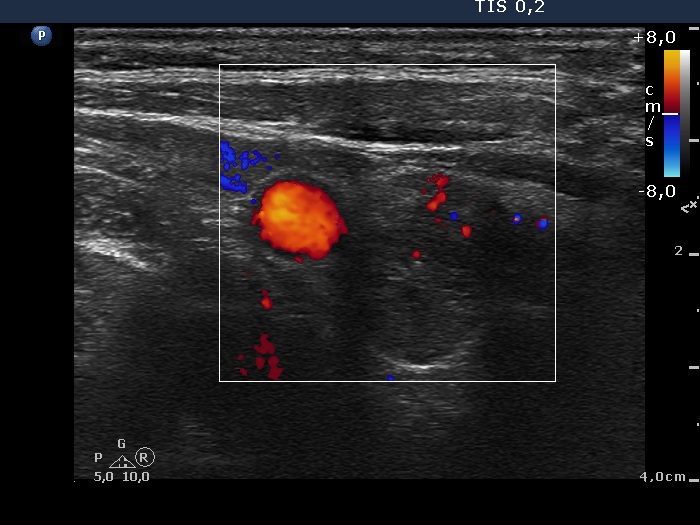 Lower part of the right lobe, horizontal scan, color Doppler mode. There are signs of intralesional blood flow.