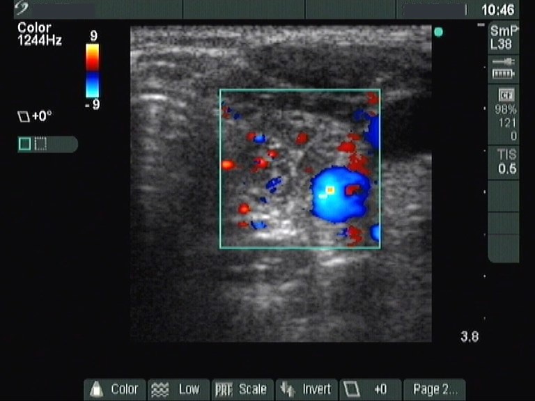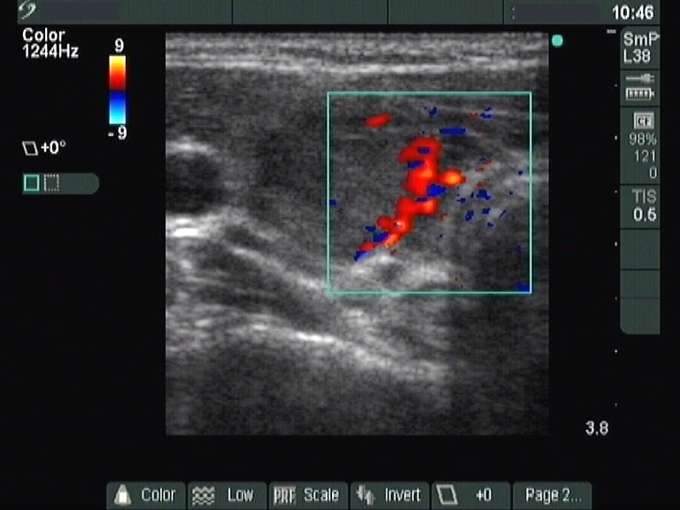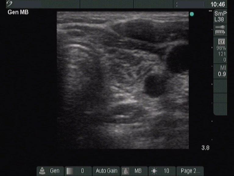 Ultrasonography: revealed hypoechogenic inhomogeneous thyroids. There was a moderately hyperechogenic nodule in the left lobe. The nodule presented a halo sign and perinodular blood flow.