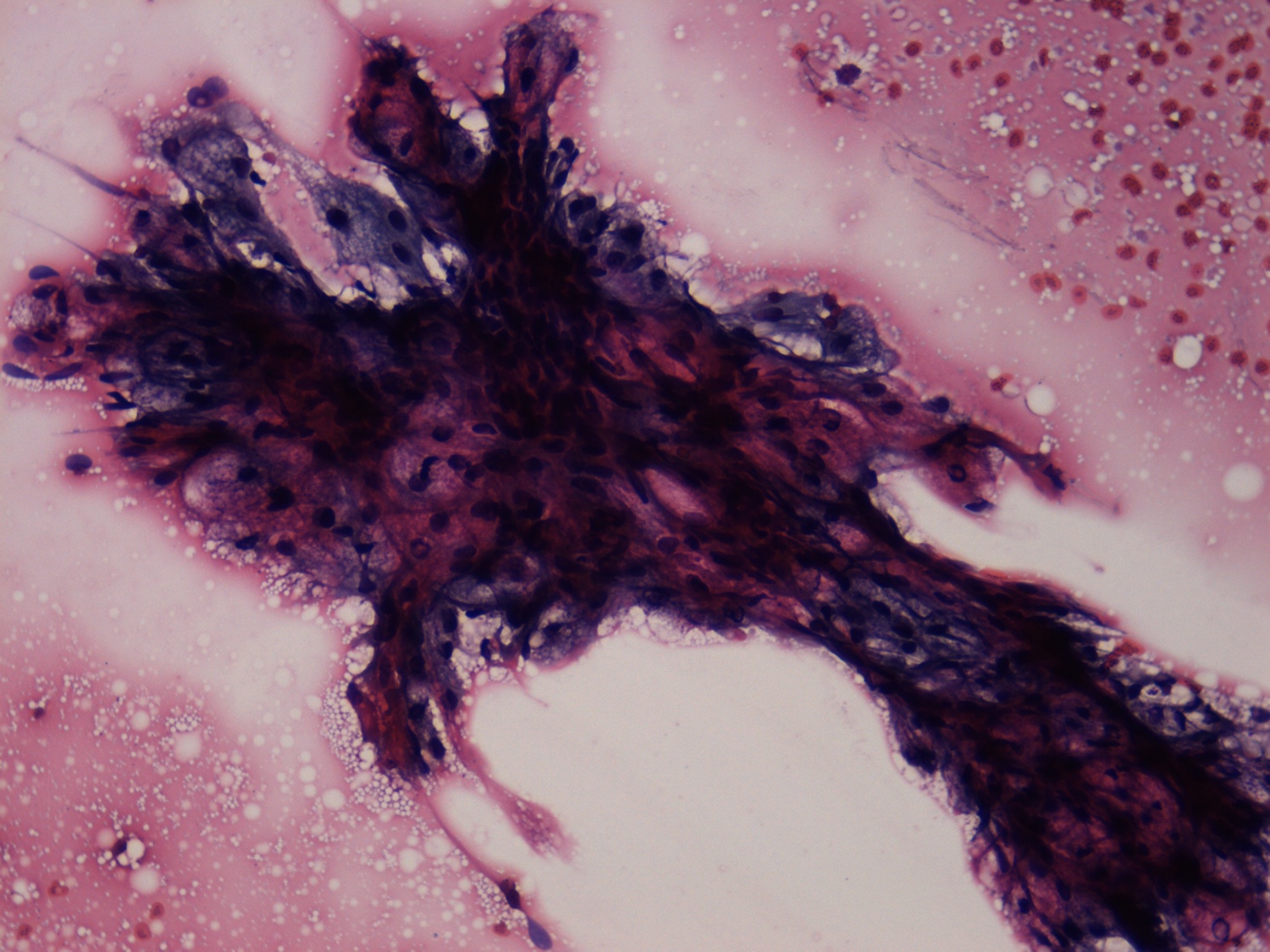 Pap-smear, 200x. There are hyperchromatic follicular cells with abundant cytoplasm within the cluster.