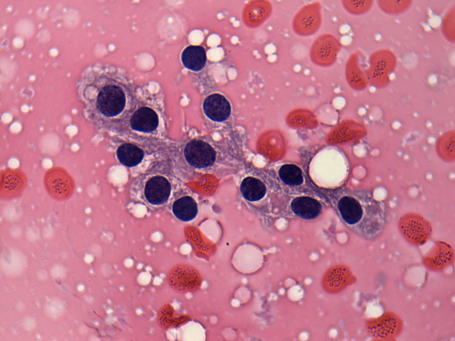 Pap-smear, 1000x. Follicular cells are even-sized and present no significant atypia.