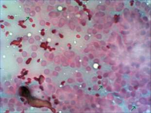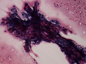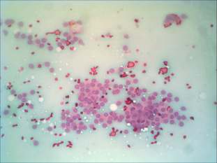Ultrasonography: a moderately hypoechogenic nodule in the right lobe. Neither halo sign nor perinodular blood flow was present. The dimensions of the nodule were 35x31x37 mm.Cytological picture of the nodule in the right lobe: no colloid in the background. Thyrocytes are arranged in monolayered sheets and in papillary structures composed of microfollicles. Follicular cells are of even size. A few intranuclear holes are present, but these are only projections of vacuoles seen in other parts of the smear, as well. There is no significant atypia.
