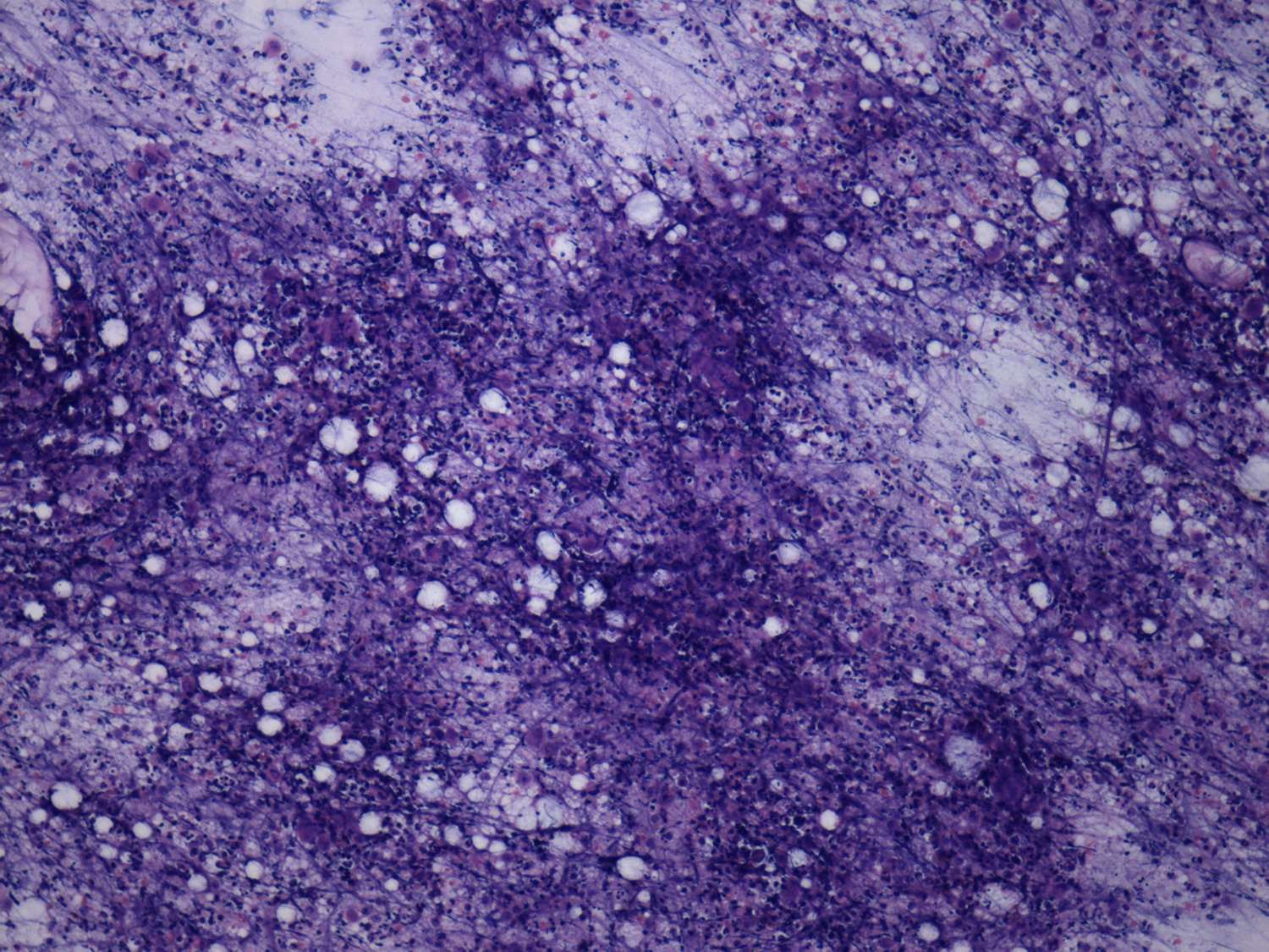 Pap-smear, 100x. A very cellular picture is presented with various inflammatory cells and debris.