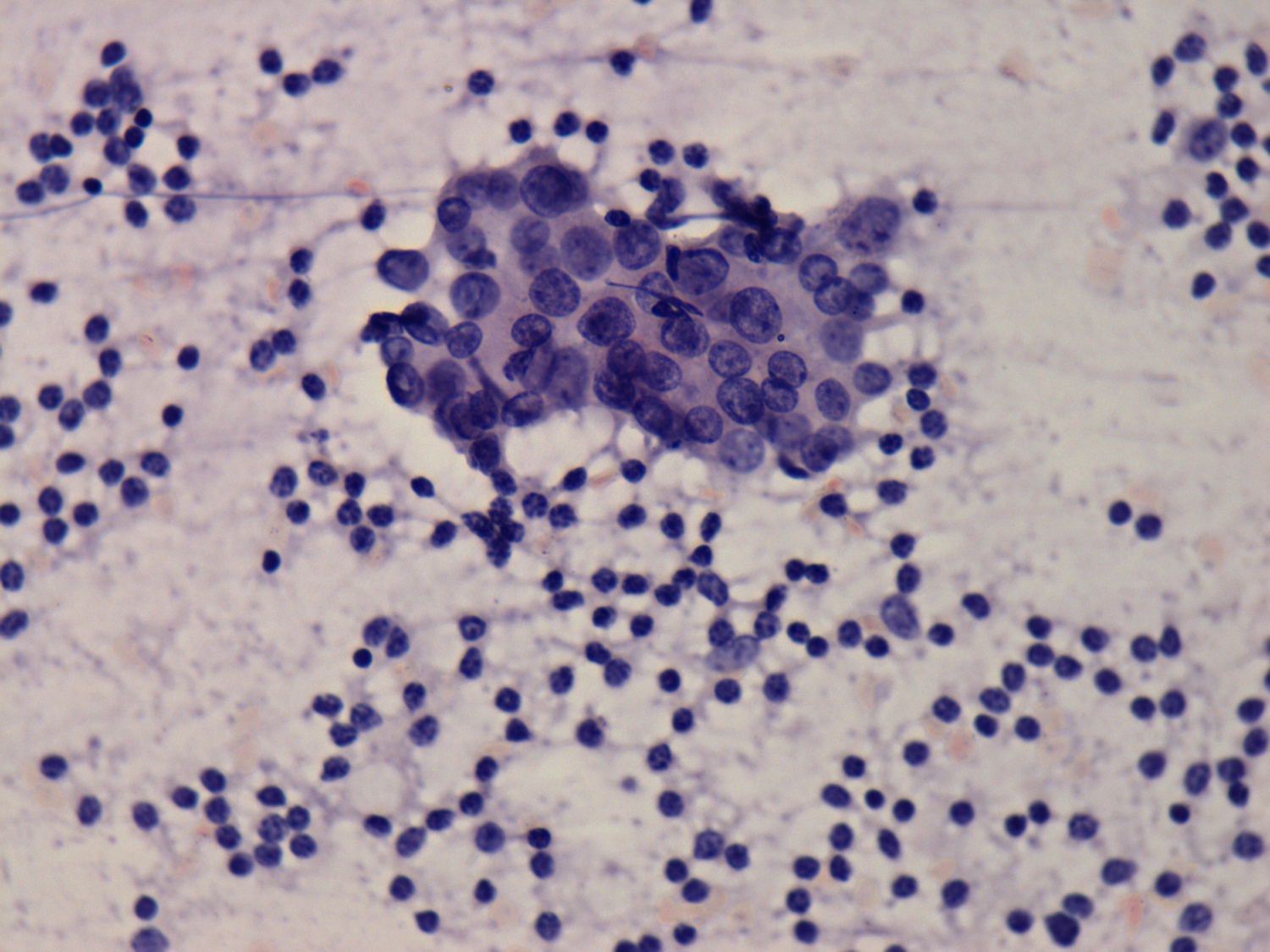 Pap-smear, 400x. The nuclei are light and contain small nucleoli.