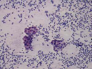 Cytological picture: there is no colloid in the background. Clusters of follicular cells were in heterogeneous lymphoid background.