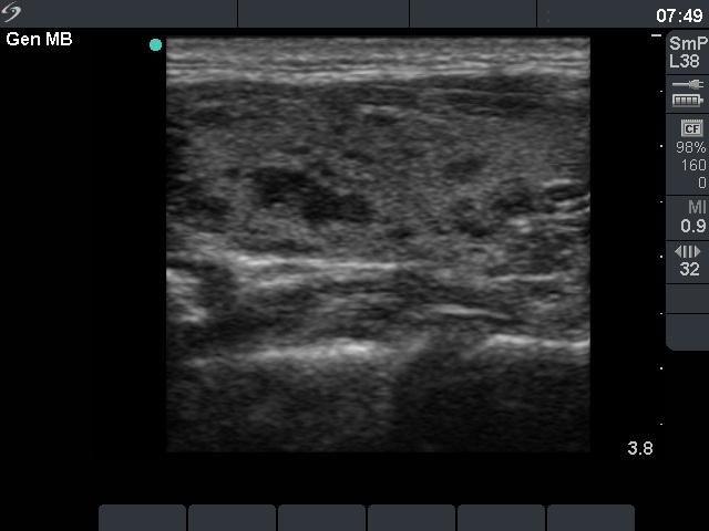 Ultrasonography: there were multiple small hypoechogenic areas in both lobes. The borders of these lesions were irregular. The US pattern corresponded to autoimmune thyroiditis.