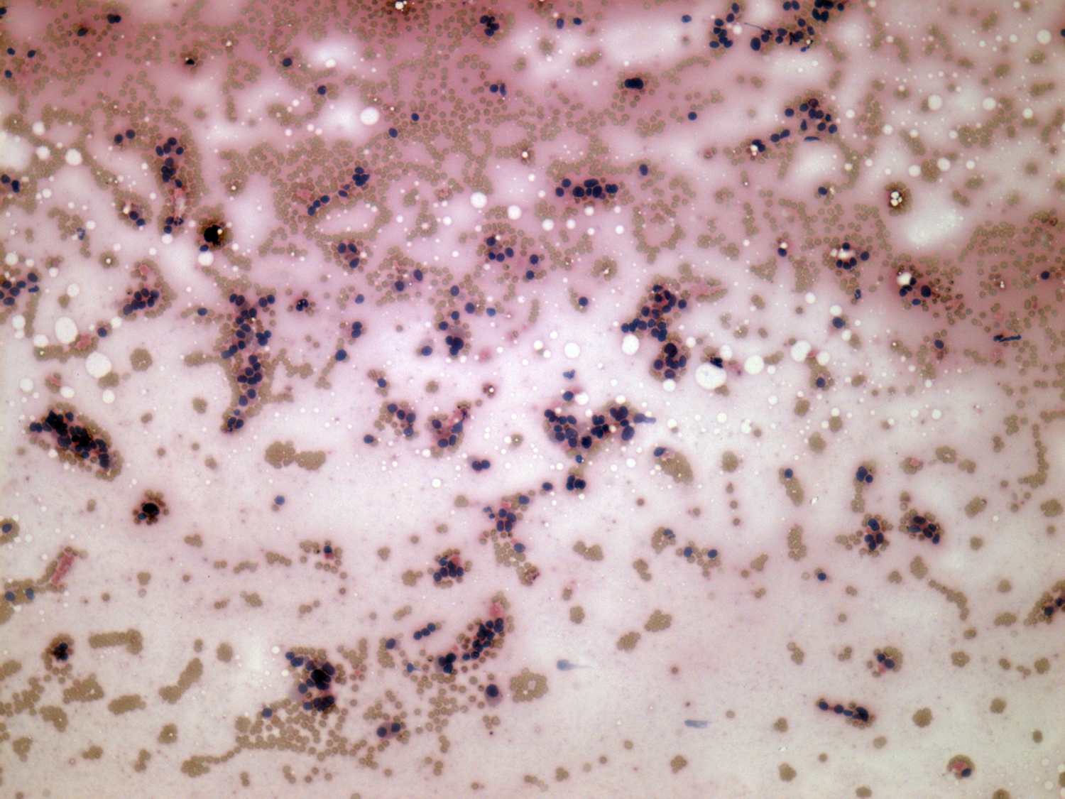 , 100x. There is no colloid in the background. Follicular cells are in small groups and dissociated.