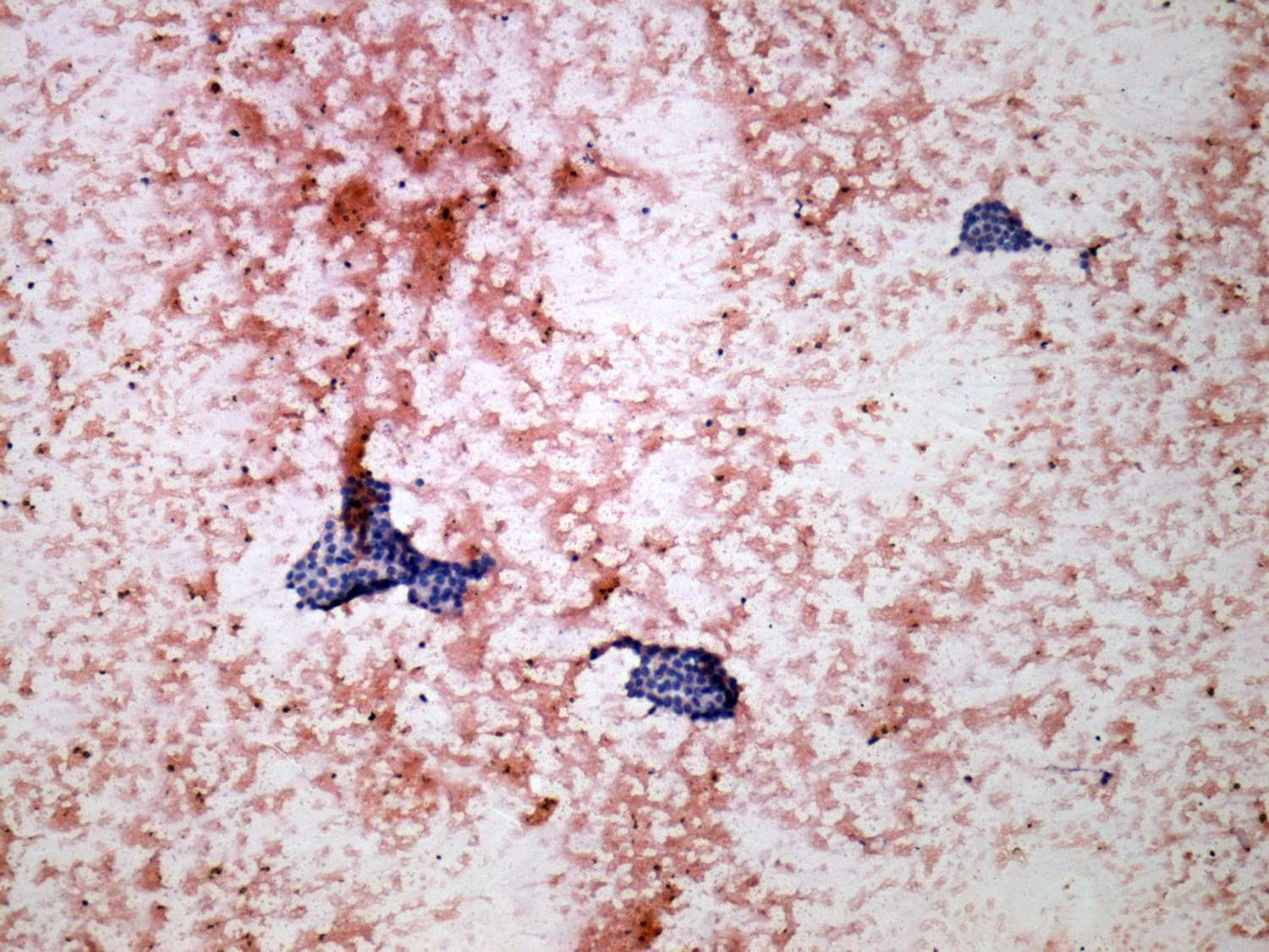 Pap-smear, 100x. There is no colloid in the background. Follicular cells are in monolayered sheets.