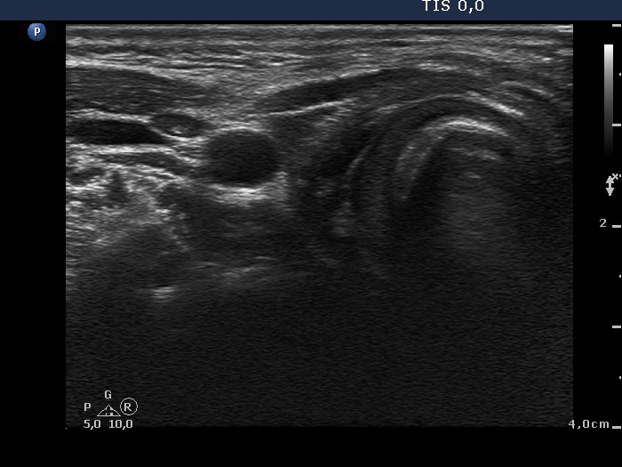Ultrasonography. The thyroid was moderately hypoechogenic. There was a small nodule in the ventral part of the right lobe. It was hypoechogenic and presented microcalcifications. The vascularization was not specific.Aspiration cytology was performed from the nodule. Monolayered sheets predominated the smear, microfollicles were found, too. A few nuclei contained inclusions and grooves. The pattern itself was not sufficient to raise the suspicion of malignancy.
