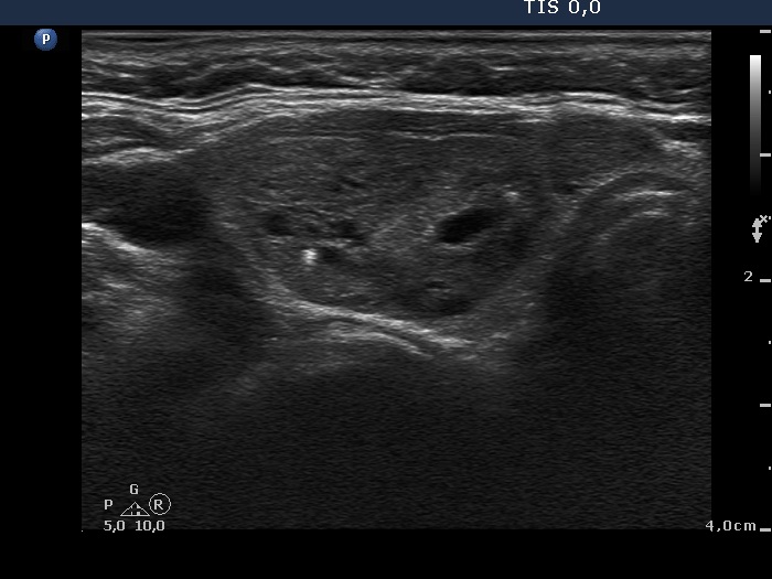 Right lobe, horizontal scan. The nodule increased significantly over time and became again moderately hypoechogenic.