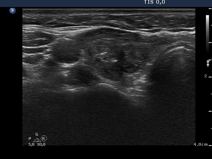 Right lobe, horizontal scan. The nodule presents a dramatic shrinkage. It became evident that the lesion is composed of two smaller nodules.