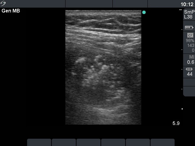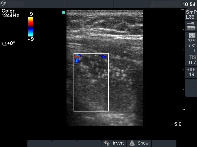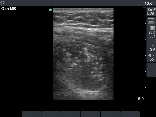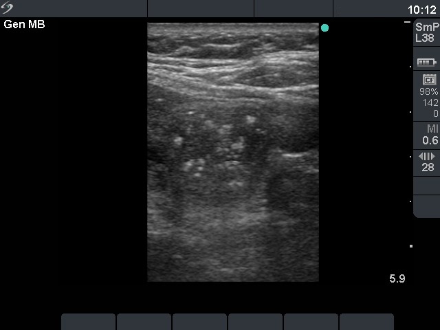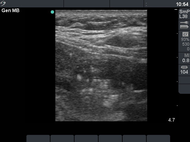 Ultrasonography: both thyroids were enlarged and echonormal. There were multiple, moderately hypoechogenic nodules in both lobes. There was a hypoechogenic nodule in the central part of the left lobe which presented hyperechogenic patches containing bright, hyperechogenic punctate granules. This pattern is similar to that observed in medullary cancer. The vascularization was not specific.