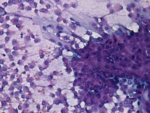 It is worth analyzing the cytological pattern. Follicular cells had a well-preserved abundant cytoplasm which mimicked oxyphilic metaplasia. The nuclei were pale because the chromatin is condensed at the periphery of nuclei. Therefore those nuclei which do not presented nucleoli seemed to contain inclusion.