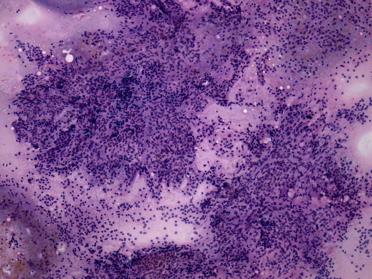 Pap-smear, 100x. Diffuse colloid precipitate in the background. Follicular cells are dissociated and in hyperplastic papillary clusters.