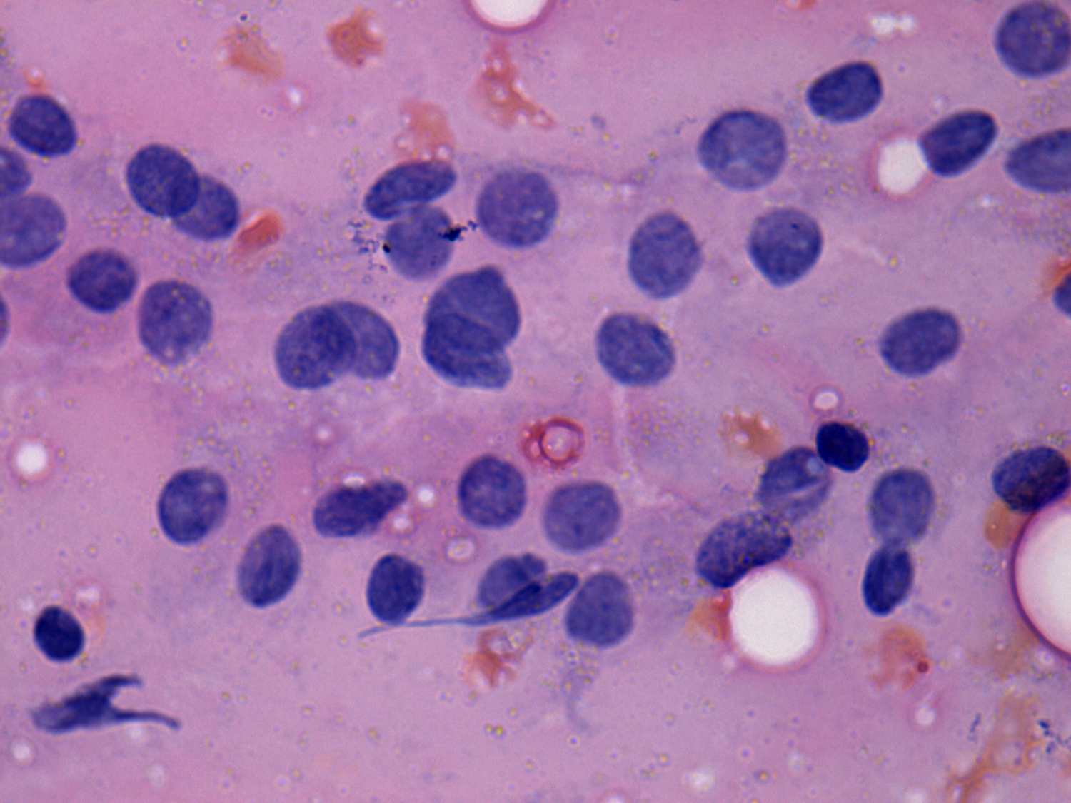 Pap-smear, 1000x. Follicular cells have blunt nuclei.