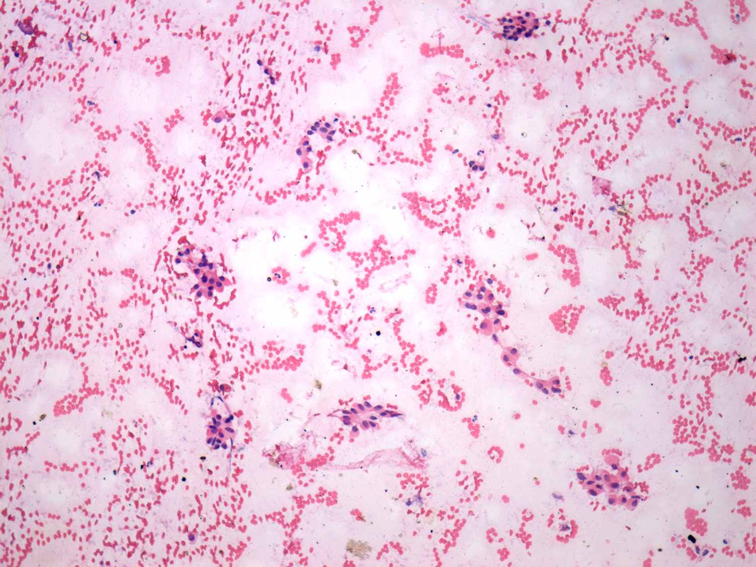 Pap-smear, 100x. There is no colloid in the background. Thyrocytes are found mostly in microfollicles.