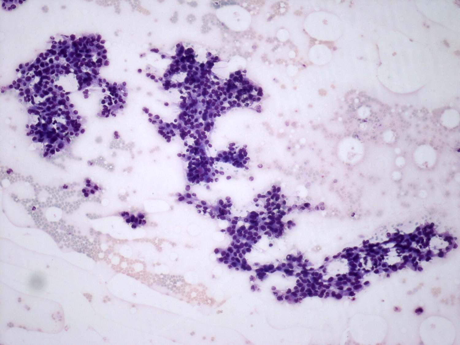 Wright-Giemsa staining, 100x. No colloid. Follicular cells in monolayered sheets.