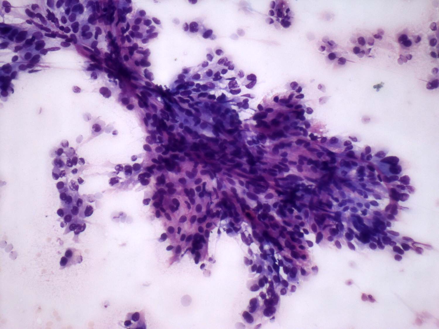 Wright-Giemsa staining, 100x. Papillary cell group with fibrovascular core.