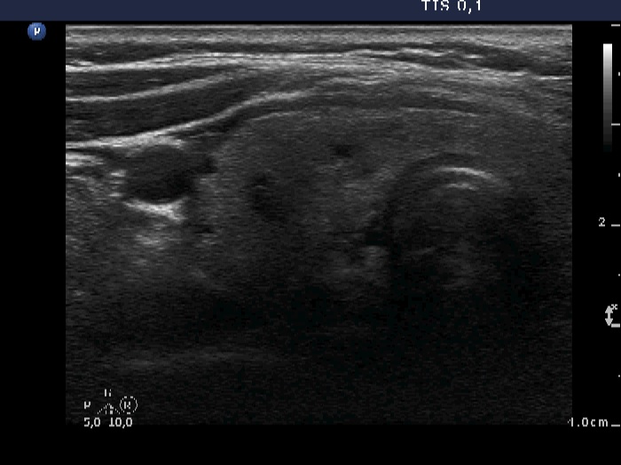 Ultrasonography. The thyroid was echonormal and contained several small cystic lesions. There was a relatively large nodule in the lower-dorsal part of the right lobe while multiple nodules with different echogenicity in the left lobe. The location of the right nodule raised the possibility of parathyroid origin.