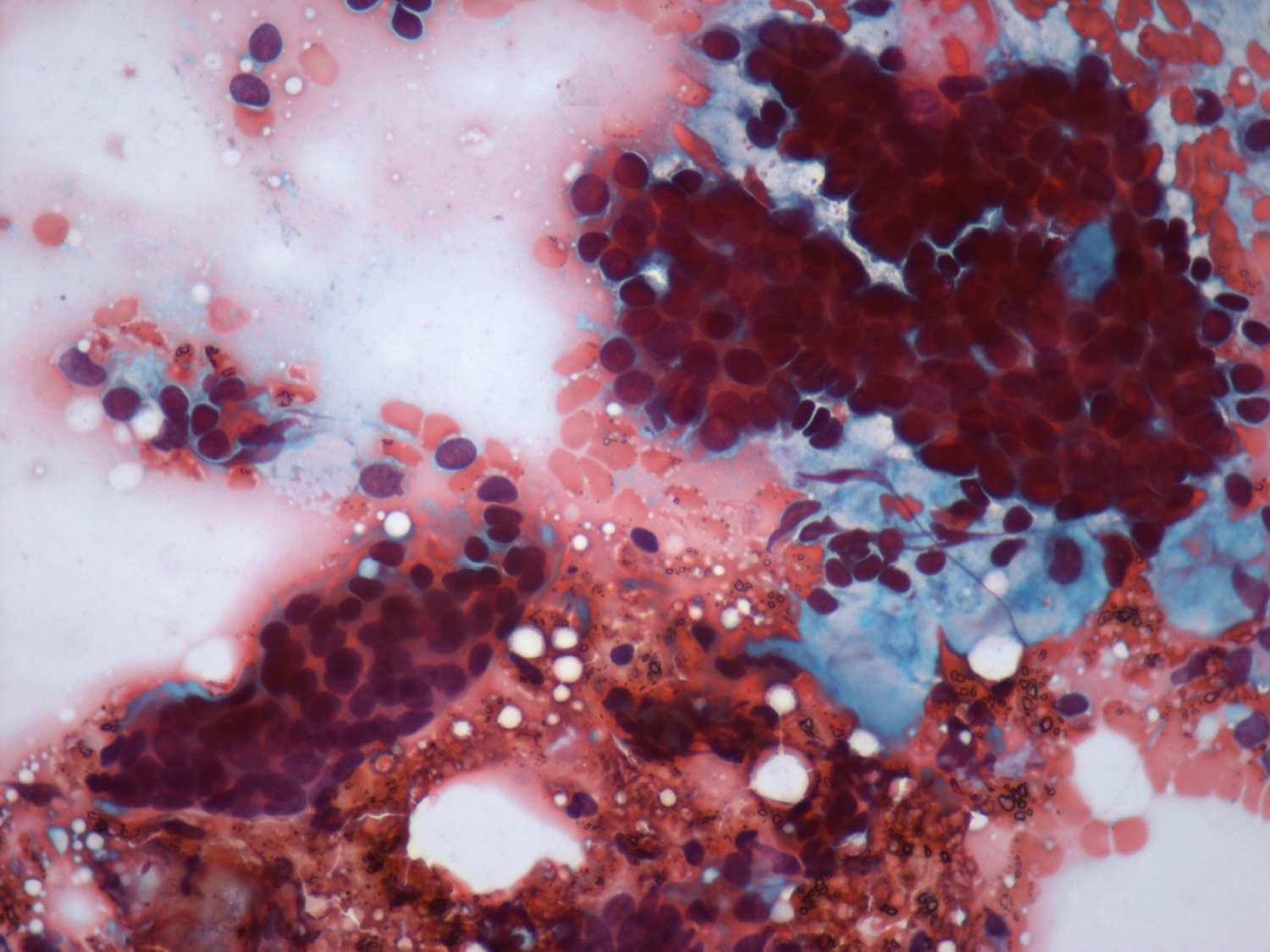 Pap-smear, 400x. These clusters highly resembles cell groups of a papillary cancer.